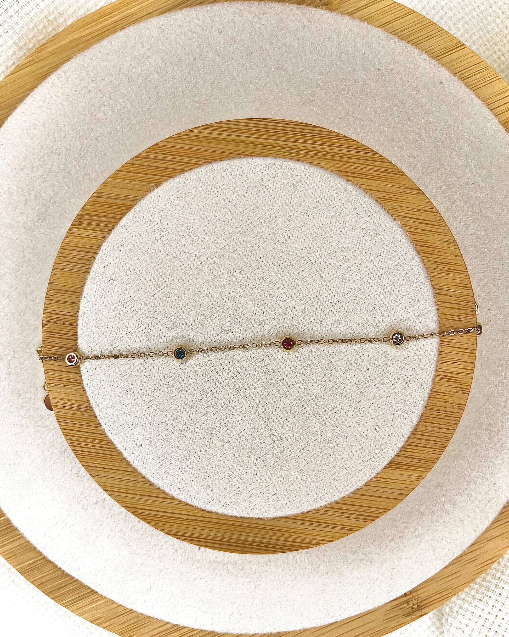 Bracelet acier inoxydable doré et oxyde de zirconium coloré.